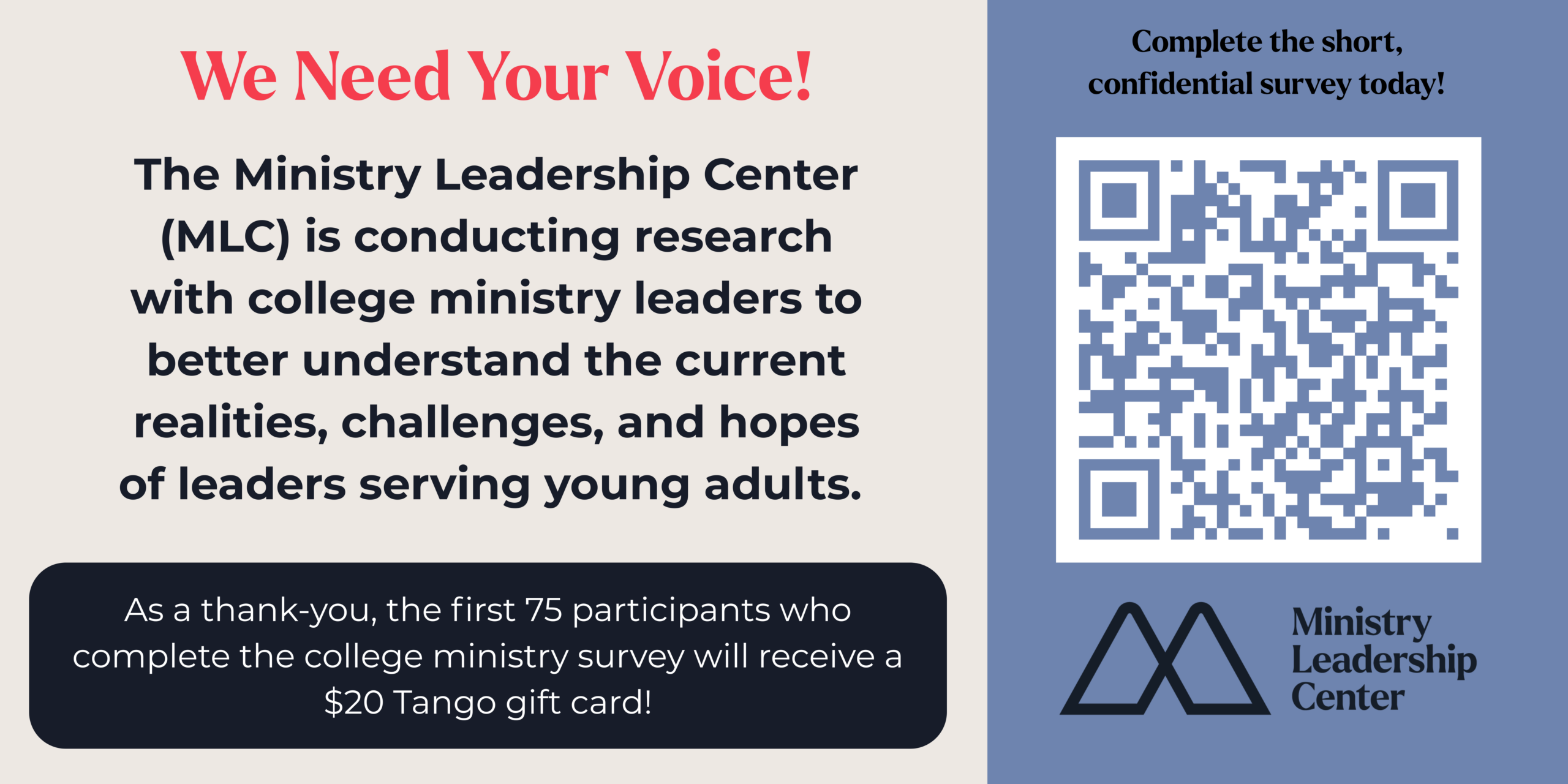 Please consider completing this short, confidential survey to help aid MLC in this research. The questions will be focused on your ministry context, the challenges you face, and possible resources that could help strengthen your ministry with college students in the years ahead. The survey takes approximately 15–30 minutes to complete. As a thank-you, the first 75 participants who complete the college ministry survey will receive a $20 Tango gift card, delivered by email within 3 business days.